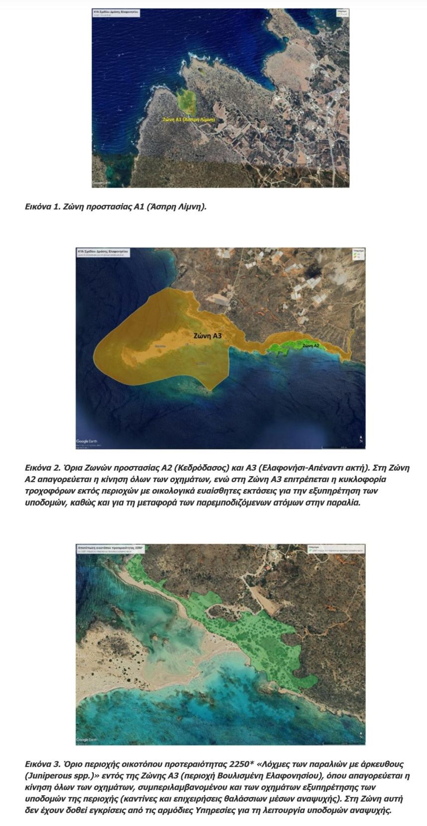 Ο καθορισμός ζωνών περιβαλλοντικής προστασίας και όρων έχει ως σκοπό τη διασαφήνιση του διαχειριστικού καθεστώτος της περιοχής για την αποτελεσματική διατήρηση σημαντικών στοιχείων της βιοποικιλότητας της περιοχής έως την έκδοση του προβλεπόμενου προεδρικού διατάγματος. Ορίζονται επτά (7) ζώνες προστασίας, οι οποίες αποτελούν αμιγώς περιβαλλοντικές/οικολογικές εκτάσεις, καθώς και οι χρήσεις, τα έργα και οι δραστηριότητες για τα οποία τίθενται ειδικοί όροι και περιορισμοί. Οι περιοχές που χαρακτηρίζονται με υψηλή οικολογική αξία και δέχονται έντονες ανθρωπογενείς πιέσεις είναι η Άσπρη Λίμνη (Ζώνη Α1), το Κεδρόδασος – Ζώνη Α2, το Ελαφονήσι και η απέναντι ακτή-περιοχή Βουλισμένη – Ζώνη Α3 (Εικόνες 1 και 2).
