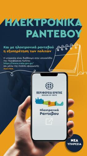 Η υπηρεσία είναι διαθέσιμη στην ιστοσελίδα της Περιφέρειας Κρήτης https://www.crete.gov.gr/ στο μενού Ηλεκτρονικά ραντεβού και μέσω κινητών συσκευών και της mobile εφαρμογής myCrete στο μενού Ψηφιακές Υπηρεσίες Πολιτών.