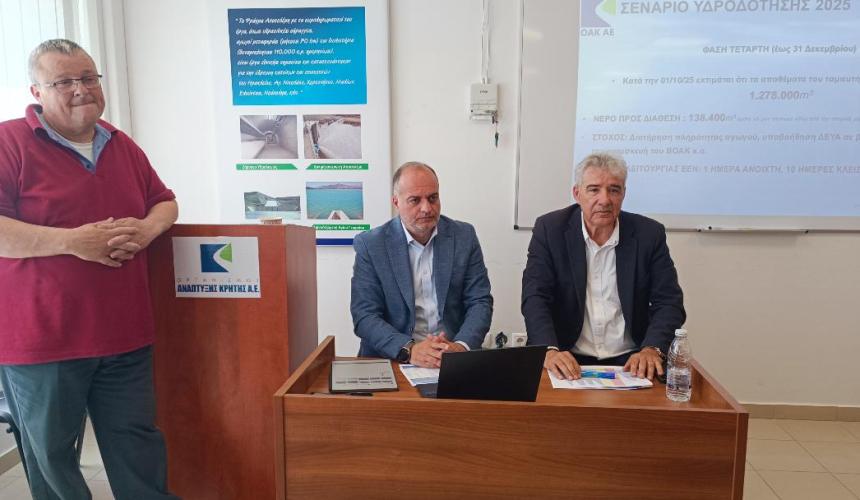 «Η εξαιρετική συνεργασία του Ο.Α.Κ. με τις Δ.Ε.Υ.Α. της Ανατολικής Κρήτης αποδίδει «καρπούς» ακόμη και σε ζητήματα που απαιτούν «δύσκολες» αποφάσεις. Έγινε ένας «σχεδιασμός», ώστε να μη βρεθούμε μπροστά σε προβλήματα που δεν θα μπορέσουμε να αντιμετωπίσουμε και είμαστε αισιόδοξοι, πως το «δύσκολο» υδρολογικά καλοκαίρι που έρχεται, το νερό δεν θα «λείψει». Οι τρεις Δ.Ε.Υ.Α. συνεργάζονται μεταξύ τους, συνεπώς βρισκόμαστε στην ευχάριστη θέση, όλοι ενωμένοι, να αντιμετωπίσουμε αυτά τα θέματα που δεν κρύβω ότι είναι πολύ σοβαρά. Για άλλη μία φορά θα πω ακόμη ότι μέσα σε όλη αυτή την «εξίσωση», θα πρέπει να ενταχθεί και ο καταναλωτής. Η χρήση του νερού, επιβάλλεται να γίνεται με πολλή μεγάλη προσοχή , θα πρέπει όλοι να συμμετέχουμε σε αυτή τη μεγάλη προσπάθεια, για να μην φτάσουμε στο σημείο μηδέν» ανέφερε σε σχετική του δήλωση, ο Διευθύνων Σύμβουλος του Οργανισμού Ανάπτυξης Κρήτης, κ. Άρης Παπαδογιάννης.