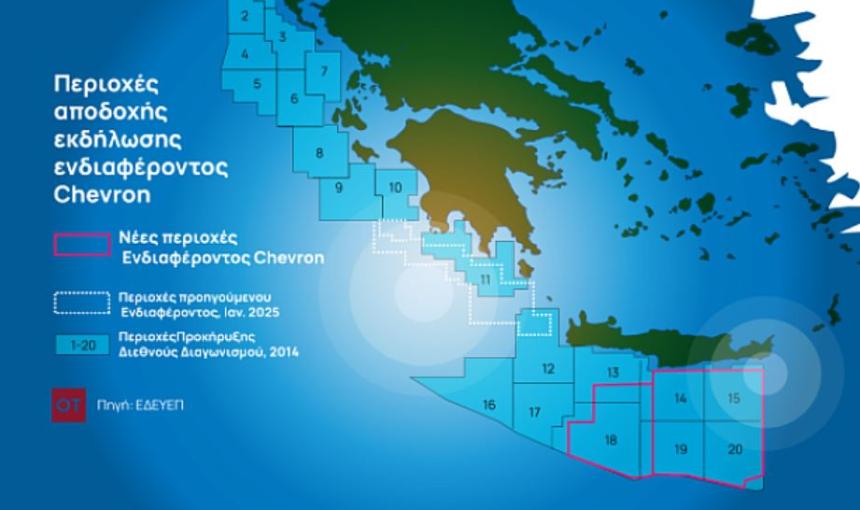 Οι τελευταίες πληροφορίες αναφέρουν ότι η ηγεσία του υπουργείου αλλά και η Ελληνική Διαχειριστική Εταιρεία Υδρογονανθράκων και Ενεργειακών Πόρων (ΕΔΕΥΕΠ) έχουν καταλήξει ώστε τα τρία θαλάσσια blocks που έχει ζητήσει η Chevron και το ένα για το οποίο εκδηλώθηκε ενδιαφέρον από την HELLENiQ ENERGY να συμπεριληφθούν σε ένα κείμενο διαγωνισμού.