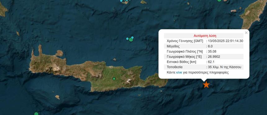 ΚΡΗΤΗ 14.05.2025 01:59Κρήτη: Ισχυρός σεισμος 6 Ρίχτερ Ρέθεμνος Newsroom Facebook Twitter Copy link 0 Ισχυρή σεισμική δόνηση σημειώθηκε τα ξημερώματα της Τετάρτης στη θαλάσσια περιοχή ανατολικά της Κρήτης και νότια της Καρπάθου, λίγα λεπτά πριν από τις 2, με τις πρώτες εκτιμήσεις του Γεωδυναμικού Ινστιτούτου να κάνουν λόγο για μέγεθος 6 Ρίχτερ. 0 Facebook Twitter Copy link ΣΧΕΤΙΚΑ ΑΡΘΡΑ Κρήτη 14.12.2025 19:53Άκαρπες οι έρευνες για τον 33χρονο γιατρό του Βενιζέλειου - Στο «κόκκινο» η αγωνία της οικογένειάς του Κρήτη 14.12.2025 19:52Χρυσοχοΐδης: «Η ΕΛΑΣ δεν έχει πλαστικές σφαίρες» – Νέες συλλήψεις προ των πυλών για την υπόθεση ΟΠΕΚΕΠΕ Κρήτη 14.12.2025 19:50Οι κατηγορίες που άσκησε η Ευρωπαική Εισαγγελία στους 15 από την Κρήτη για το σκάνδαλο ΟΠΕΚΕΠΕ Κρήτη 14.12.2025 19:47ΕΛΜΕ Ρεθύμνου: Κάλεσμα στην απεργιακή συγκέντρωση την Τρίτη 16 Δεκεμβρίου