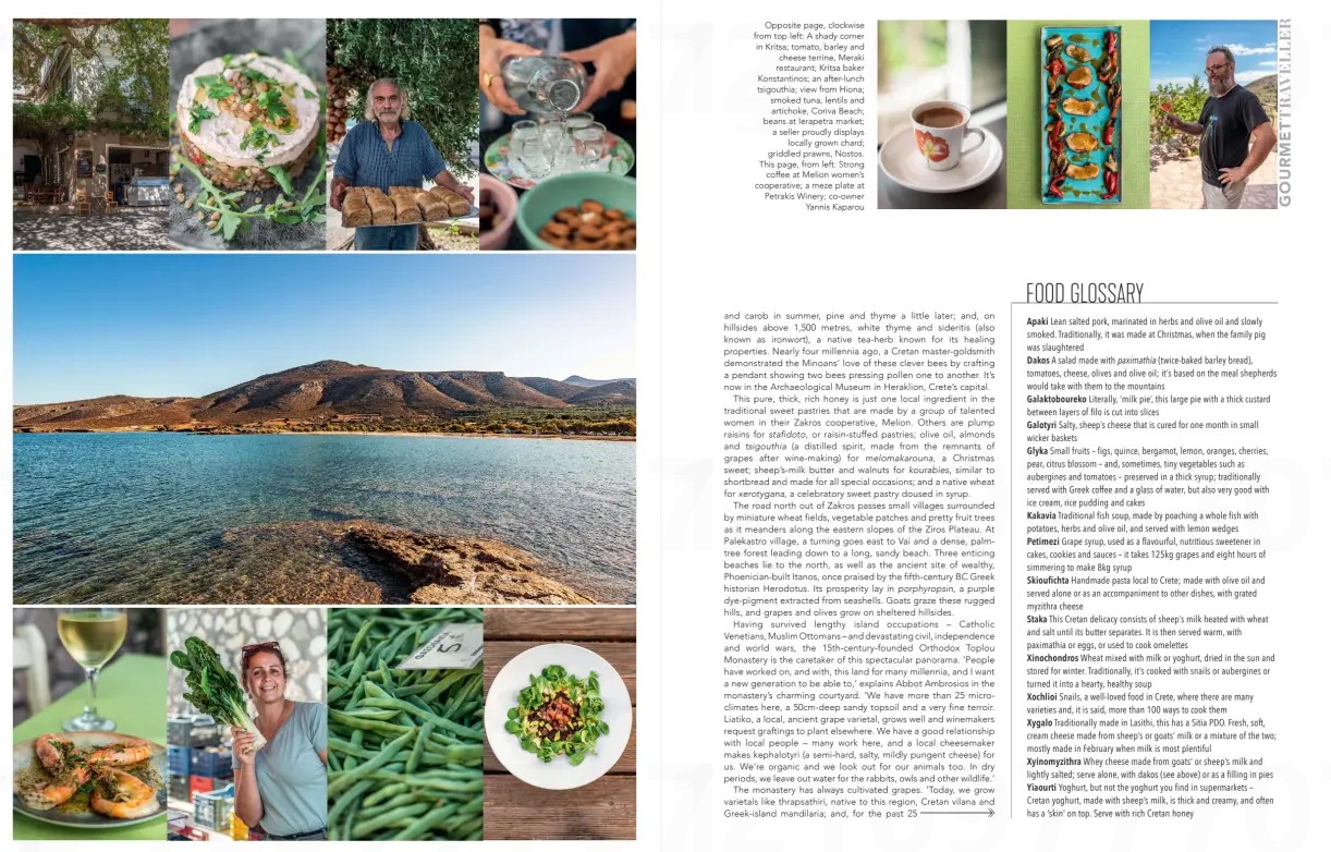 Το 14σέλιδο αφιέρωμα προσκαλεί τους αναγνώστες να "ανακαλύψουν τις γεύσεις, παραδόσεις και το συναρπαστικό τοπίο της ανατολικής Κρήτης, όπου η ιστορία και η φιλοξενία συνυπάρχουν. Μέσα από πλούσιο φωτογραφικό υλικό και λεπτομερή κείμενα, το αφιέρωμα αναδεικνύει την αυθεντικότητα της κρητικής γαστρονομίας, τα ποιοτικά τοπικά προϊόντα της Περιφερειακής Ενότητας Λασιθίου, τις παραδοσιακές συνταγές και τα έθιμα που συνδέονται με την κρητική διατροφή. Περιλαμβάνει επίσης πρακτικές πληροφορίες και ένα χρήσιμο γλωσσάρι γαστρονομικών όρων της Κρήτης.