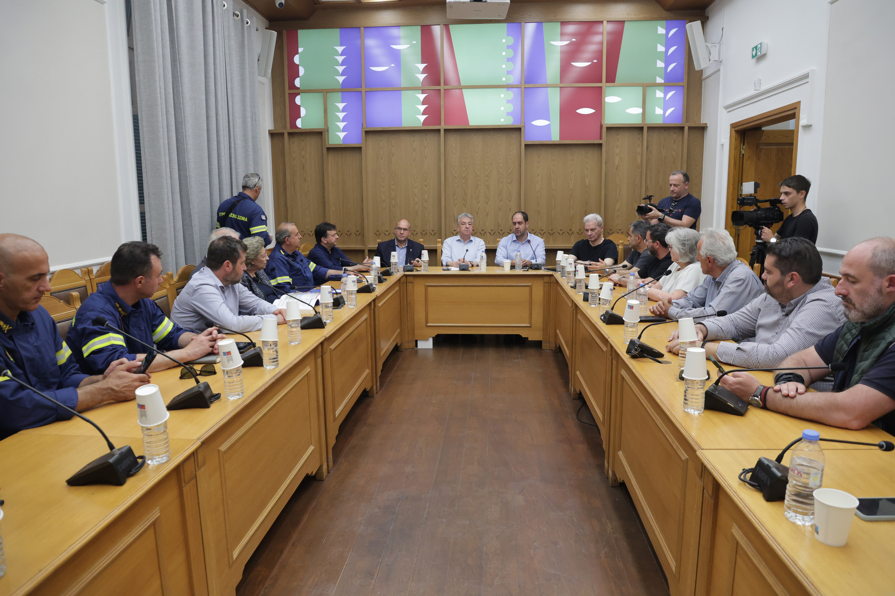 Η σύσκεψη έγινε με την παρουσία του Γενικού Γραμματέα Πολιτικής Προστασίας Νίκου Παπαευσταθίου, του Προέδρου του Οργανισμού αντισεισμικού Σχεδιασμού και Προστασίας Ευθύμιου Λέκκα, του Διοικητή της Πυροσβεστικής Υπηρεσίας Κρήτης Αρχιπύραρχου Μιχάλη Σεληνιωτάκη, του Δημάρχου Ηρακλείου Αλέξη Καλοκαιρινού και εκπροσώπων της Πολιτικής Προστασίας, της Περιφέρειας Κρήτης και τοπικών φορέων, με στόχο την ολοκληρωμένη αποτίμηση της κατάστασης και τον συντονισμό των ενεργειών.