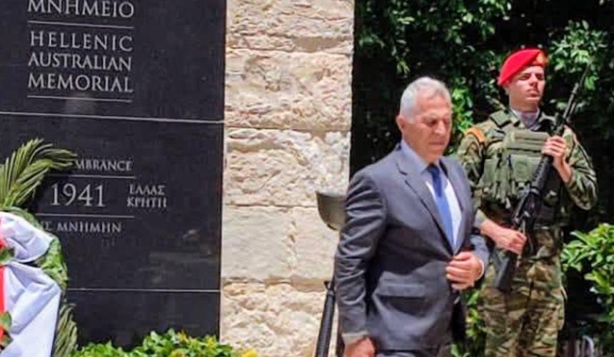 Στεφάνι κατέθεσε στο Γερμανικό νεκροταφείο καθώς και στο Μνημείο Μάχης Κρήτης, στο αεροδρόμιο Μάλεμε όπου ολοκληρώθηκαν οι πολυήμερες επετειακές εκδηλώσεις μνήμης, με την τελετή λήξης.