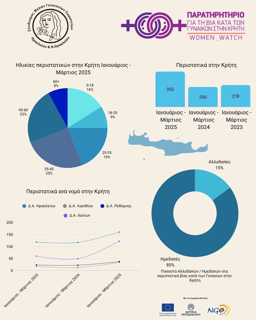 Εξάλλου, σταθερά αυξητικές τάσεις εμφανίζουν το πρώτο τρίμηνο του 2025 τα περιστατικά βίας κατά των γυναικών, τα οποία αναφέρονται στις Αστυνομικές Αρχές στην Κρήτη (353), σε σύγκριση με τις αντίστοιχες περιόδους των ετών 2024 (200) και 2023 (218).
