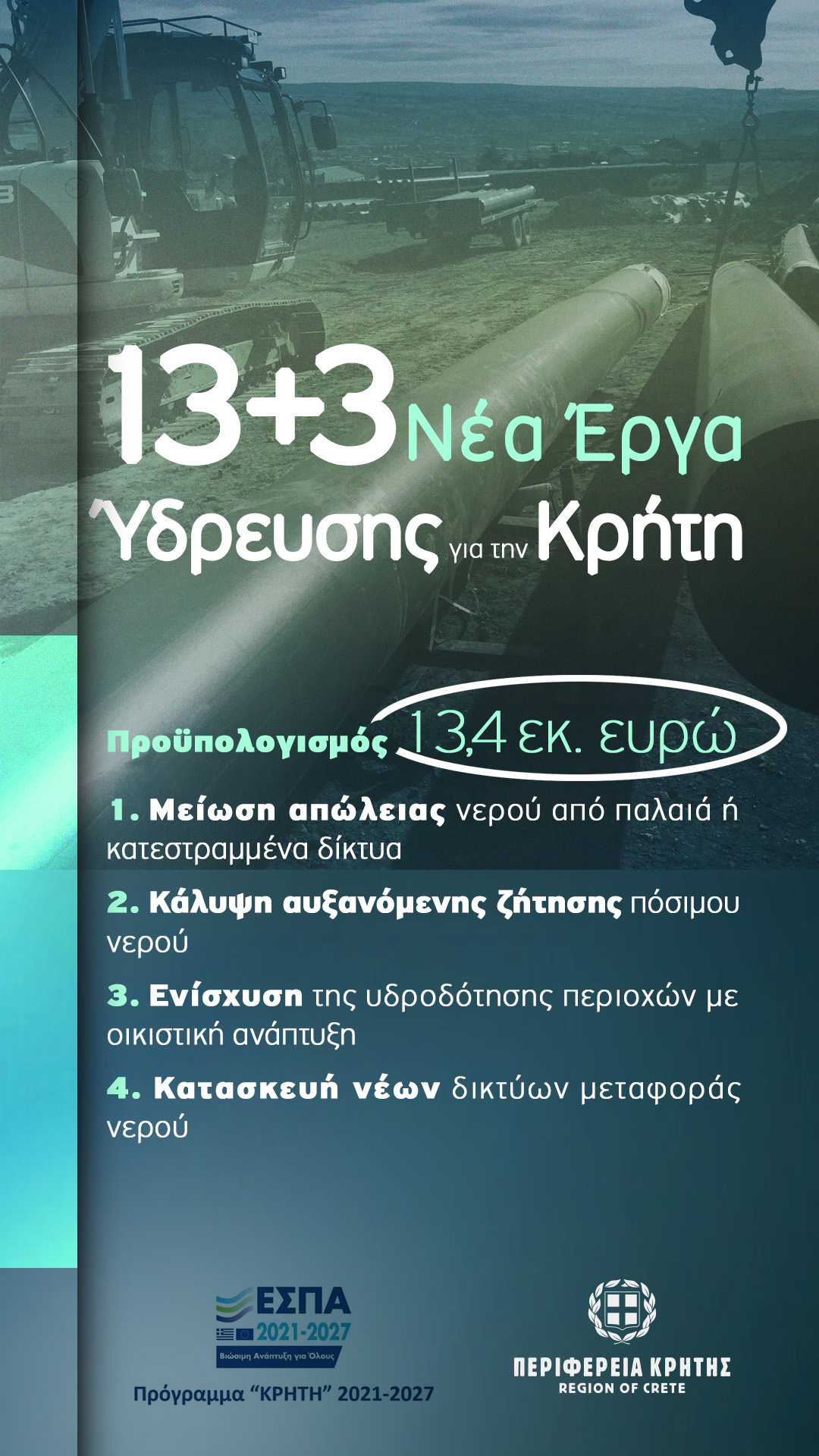 Η Περιφέρεια Κρήτης συνεχίζει να επενδύει με συνέπεια σε κρίσιμες υποδομές που προστατεύουν τους υδάτινους πόρους, βελτιώνουν την καθημερινότητα των πολιτών και συμβάλλουν στη βιώσιμη ανάπτυξη του νησιού.