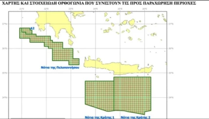 Η πρόσκληση αφορά 4 θαλάσσιες περιοχές: Νότια της Κρήτης 1, Νότια της Κρήτης 2, Νότια της Πελοποννήσου για τις οποίες εκδήλωσε ενδιαφέρον τον περασμένο Ιανουάριο η αμερικανική Chevron και το “οικόπεδο” Α2 για το οποίο ενδιαφέρθηκε η Helleniq Energy.