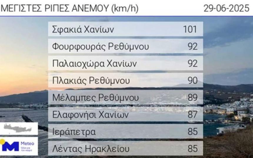 Εντυπωσιακής έντασης βόρειοι άνεμοι σαρώνουν σήμερα, Κυριακή 29 Ιουνίου, την Κρήτη, με τις ριπές να αγγίζουν τα 101 χιλιόμετρα την ώρα στην περιοχή των Σφακίων, στα Χανιά.