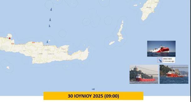 Το βράδυ της Κυριακής, το Oruc Reis και τα συνοδευτικά του σκάφη εντοπίστηκαν σε θαλάσσια περιοχή νοτιοανατολικά της Κρήτης