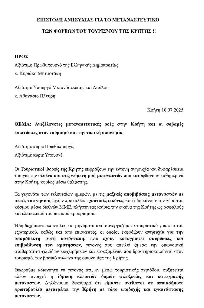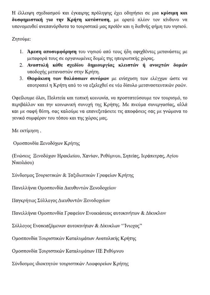 Επιστολή με αποδέκτη τον Πρωθυπουργό Κυριάκο Μητσοτάκη για το μείζον θέμα που προέκυψε τις τελευταίες μέρες των ανεξέλεγκτων μεταναστευτικών ροών στην Κρήτη και τις σοβαρές επιπτώσεις στον τουρισμό και την τοπική οικονομία απέστειλε χθες η Ομοσπονδία Ξενοδόχων Κρήτης, σε συνεργασία με τις Ενώσεις Ξενοδόχων Ηρακλείου, Χανίων, Ρεθύμνου, Σητείας, Ιεράπετρας & Αγίου Νικολάου, επίσης ο Σύνδεσμος Τουριστικών & Ταξιδιωτικών Γραφείων Κρήτης, η Πανελλήνια Ομοσπονδία Διευθυντών Ξενοδοχείων, ο Παγκρήτιος Σύλλογος Διευθυντών Ξενοδοχείων, η Πανελλήνια Ομοσπονδία Γραφείων Ενοικιάσεως αυτοκινήτων & Δίκυκλων, ο Σύλλογος Ενοικιαζόμενων αυτοκινήτων & Δίκυκλων ‘’Ινιοχος’’, η Ομοσπονδία Τουρ. Καταλυμάτων Ανατ. Κρήτης, η Ομοσπ. Τουριστ. Καταλυμάτων ΠΕ Ρεθύμνου και ο Σύνδεσμος ιδιοκτητών τουριστικών Λεωφορείων Κρήτης.