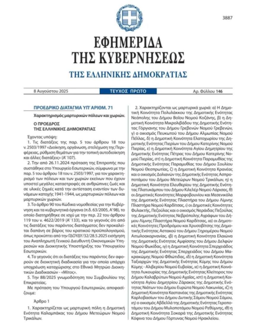 Η απόφαση αυτή έρχεται μετά από πολυετή προσπάθεια και έξι χρόνια αναμονής από τη σχετική συνεδρίαση της αρμόδιας επιτροπής, η οποία είχε επεξεργαστεί τα αιτήματα με ιστορικά και τεκμηριωμένα στοιχεία. Πρόκειται για μια σημαντική στιγμή δικαίωσης για τις τοπικές κοινωνίες που κουβαλούν βαριά ιστορική μνήμη, εξαιτίας των θηριωδιών που υπέστησαν κατά τη διάρκεια της Κατοχής και της Εθνικής Αντίστασης.