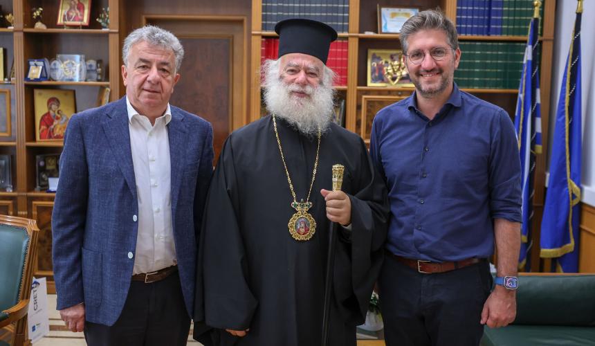Σε μία συνάντηση με ιδιαίτερο συμβολισμό, ο Περιφερειάρχης Κρήτης, Σταύρος Αρναουτάκης, υποδέχθηκε σήμερα στην Περιφέρεια Κρήτης τον Μακαριώτατο Πάπα και Πατριάρχη Αλεξανδρείας και πάσης Αφρικής, κ.κ. Θεόδωρο Β',