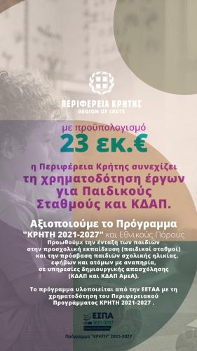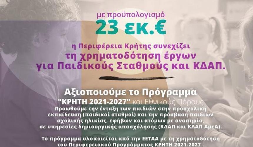 Με χρηματοδότηση του Προγράμματος ΚΡΗΤΗ 2021-2027 και Εθνικών πόρων, συνεχίζεται για δύο ακόμη χρόνια (έως και το 2027) η ένταξη των παιδιών στην προσχολική εκπαίδευση (παιδικοί σταθμοί), καθώς και η πρόσβαση παιδιών σχολικής ηλικίας, εφήβων και ατόμων με αναπηρία σε υπηρεσίες δημιουργικής απασχόλησης (ΚΔΑΠ και ΚΔΑΠ ΑμεΑ) στην Κρήτη.