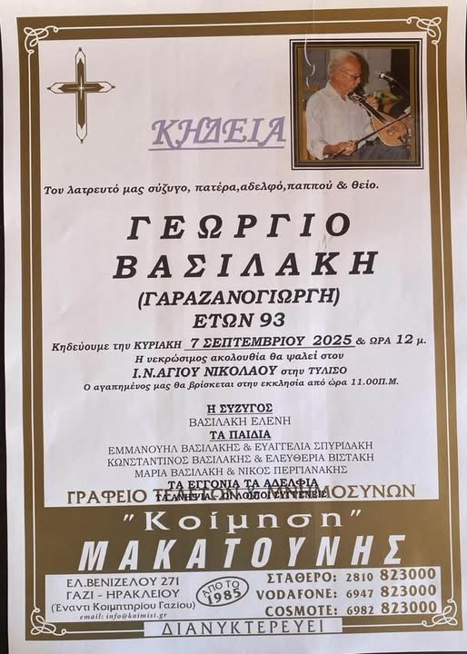 Ο τελευταίος αποχαιρετισμός θα γίνει στην Τύλισσο την Κυριακή 7 Σεπτεμβρίου και ώρα 12:00 στον Ιερό Ναό Αγίου Νικολάου.