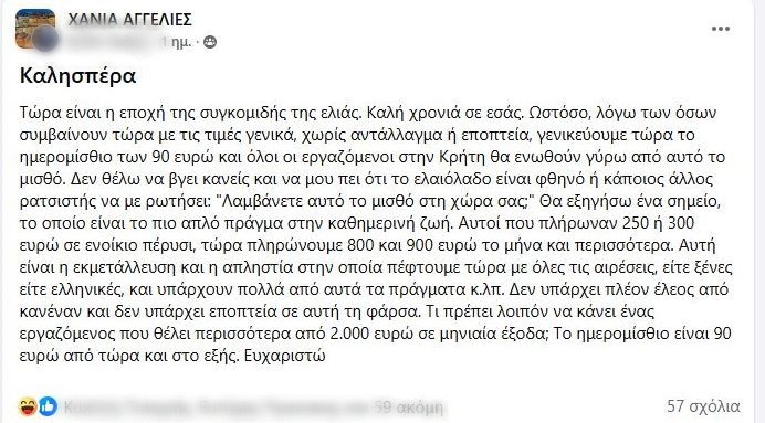 Δείτε την ανάρτηση και τα σχόλια που “οργιάζουν”: “Βάλε κάτι παραπάνω, ο νιος είναι λεβέντης…”, “δε φταις εσύ, αυτοί που σε έφεραν εδώ φταίνε”, “θα τσι μαζόξομε μόνοι μας”, ” να τσι φάνε τα πουλιά”, “σου δίνω τις ελιές και θα μου δίνεις εσύ 90 ευρώ μεροκάματο” !