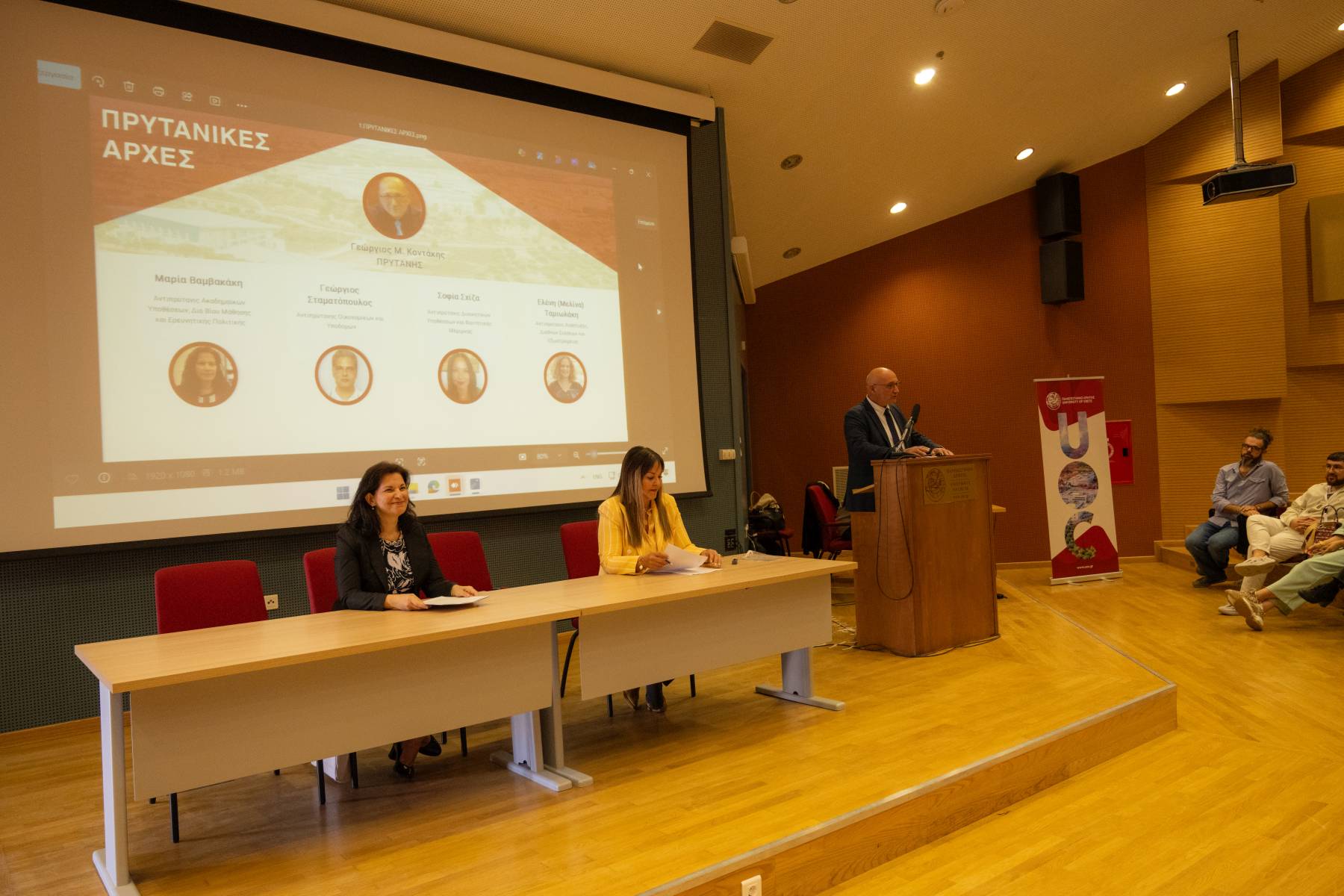 Τους φοιτητές/τριες καλωσόρισε ο Πρύτανης του Πανεπιστημίου Κρήτης, Καθηγητής Γεώργιος Μ. Κοντάκης, ο οποίος εξέφρασε τις θερμές ευχές του για μια δημιουργική και επιτυχημένη ακαδημαϊκή πορεία, αναφέροντας ότι “Η ένταξή σας στην πανεπιστημιακή κοινότητα αποτελεί ένα σημαντικό επίτευγμα και αξίζετε θερμά συγχαρητήρια για την επιτυχία σας. Το Πανεπιστήμιο Κρήτης δεσμεύεται να σας προσφέρει τις καλύτερες δυνατές συνθήκες για την ακαδημαϊκή, επαγγελματική και προσωπική σας εξέλιξη.”