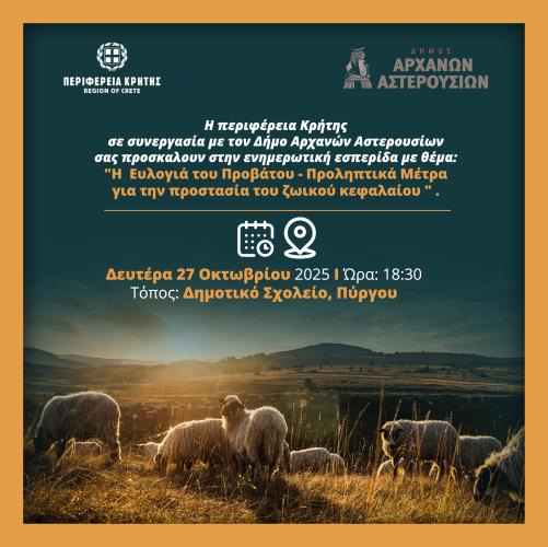 Η επόμενη ενημερωτική ημερίδα θα πραγματοποιηθεί σε συνεργασία με τον Δήμο Αρχανών - Αστερουσίων, την Δευτέρα 27 Οκτωβρίου 2025, στις 18:30, στην αίθουσα του Δημοτικού Σχολείου Πύργου. Η συμμετοχή των κτηνοτρόφων κρίνεται απαραίτητη για την αποτελεσματική θωράκιση της τοπικής κτηνοτροφίας.