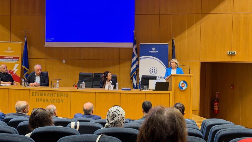 Πραγματοποιήθηκε με επιτυχία την Πέμπτη 23 Οκτωβρίου 2025, στην Αίθουσα Καστελλάκη του Επιμελητηρίου Ηρακλείου, η εκδήλωση ολοκλήρωσης του «Καινοτόμου - Πιλοτικού Προγράμματος Επιμόρφωσης στη Διαχείριση Κινδύνων & Κρίσεων στο Σχολικό Περιβάλλον στην Περιφέρεια Κρήτης» υπό το συντονισμό της Εντεταλμένης Συμβούλου Παιδείας και Δια Βίου Μάθησης της Περιφέρειας Κρήτης, Ελένης Μαράκη-Μπελαδάκη.
