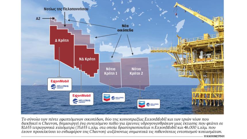 Με ενδιαφέρον αναμένονται και οι αποφάσεις της αμερικανικής εταιρείας για το δεύτερο οικόπεδο, δυτικώς της Κρήτης, για το οποίο έχει ζητήσει και έχει λάβει από την ΕΔΕΥΕΠ δύο παρατάσεις μέχρι σήμερα για την ολοκλήρωση του προγράμματος ερευνών, με την τελευταία να λήγει τον Μάρτιο του 2026.