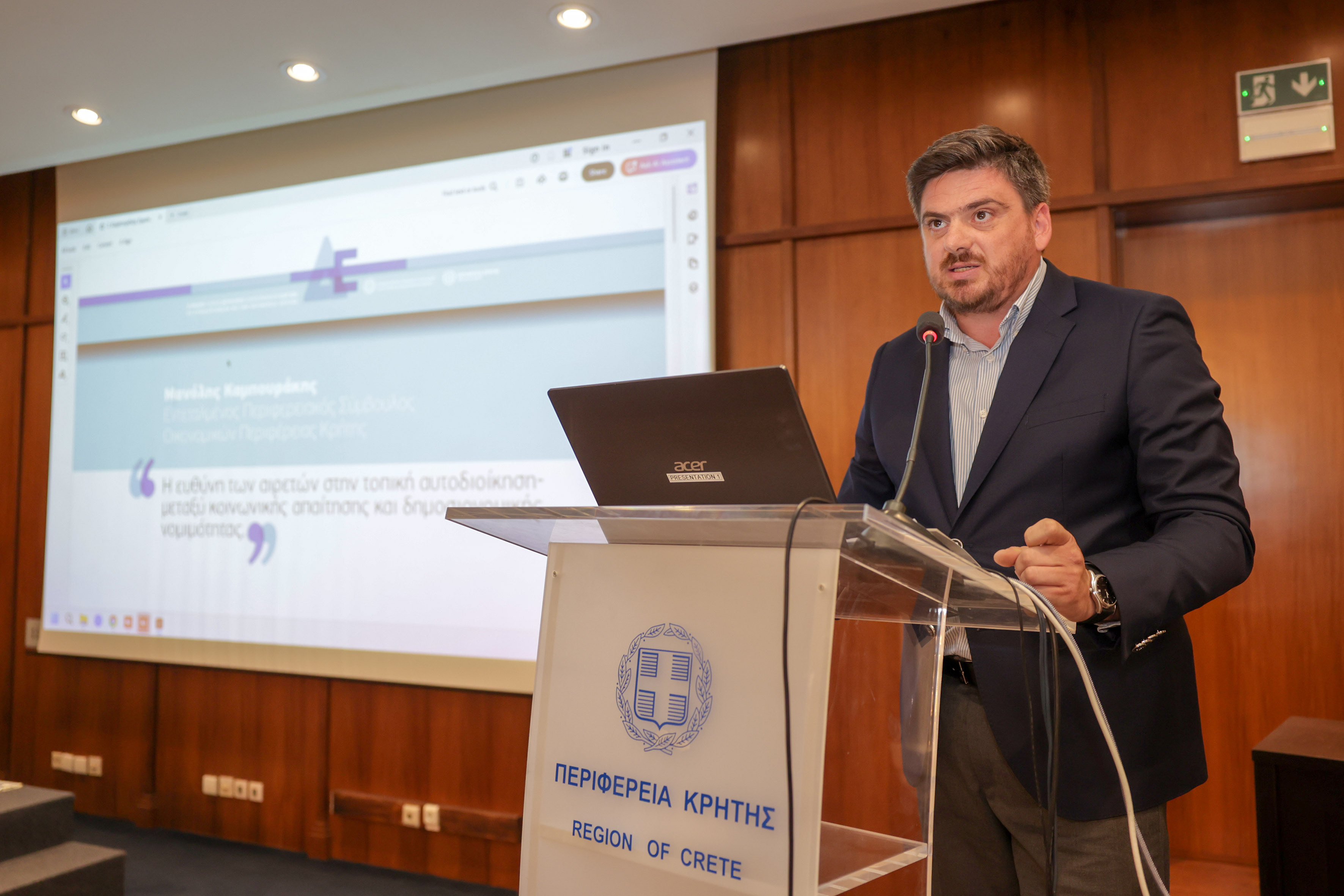 Ο Περιφερειάρχης Κρήτης Σταύρος Αρναουτάκης, καλωσορίζοντας τον κ. Γεωργίου, τα στελέχη του Υπουργείου, τους εκλεκτούς ομιλητές, τους συνέδρους, τόνισε «πως για όλους εμάς που ασκούμε διοίκηση και υλοποιούμε αναπτυξιακές πολιτικές, η τήρηση της νομιμότητας ενισχύει την πολλαπλασιαστικότητα των παρεμβάσεών μας, καθώς κάθε δαπάνη μετατρέπεται σε χρήσιμη επένδυση για την κοινωνία, τους πολίτες, την περιοχή και τη χώρα μας».