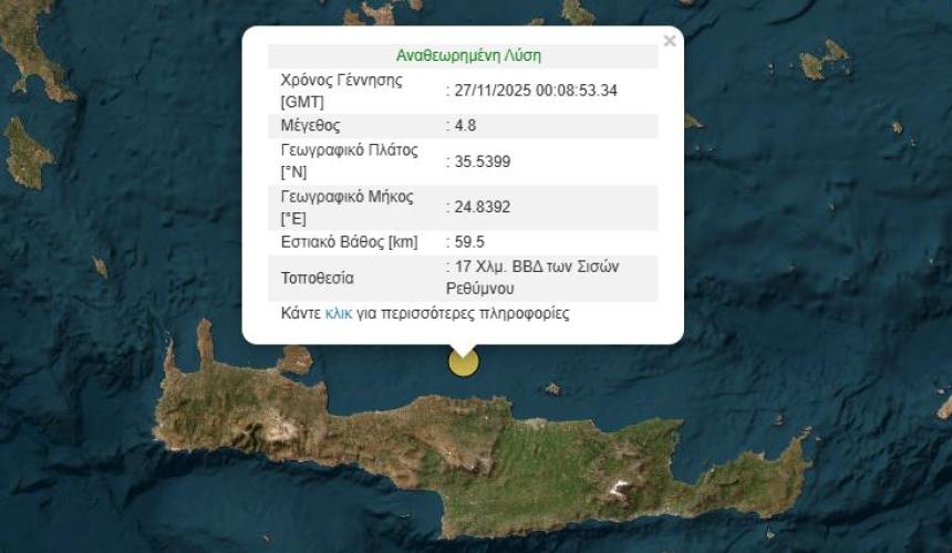 Σεισμός συνέβη λίγο μετά τις 2 τα ξημερώματα βορειοδυτικά του Ηρακλείου.