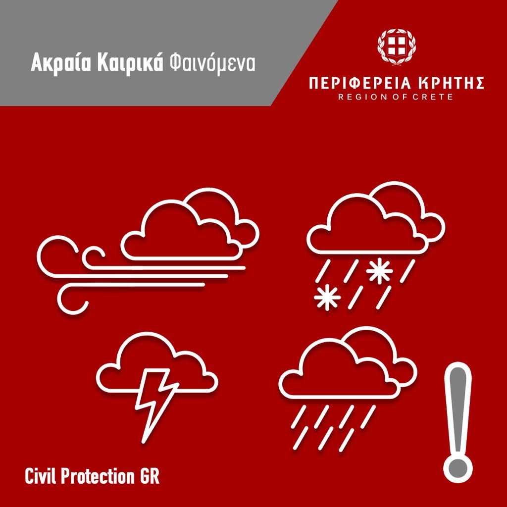 Όλες οι Υπηρεσίες και τα Τεχνικά Μέσα της Περιφέρειας Κρήτης που αποτελούν τον μηχανισμό πολιτικής προστασίας έχουν τεθεί σε κατάσταση αυξημένης ετοιμότητας, σύμφωνα με τα προβλεπόμενα στον επιχειρησιακό σχεδιασμό.