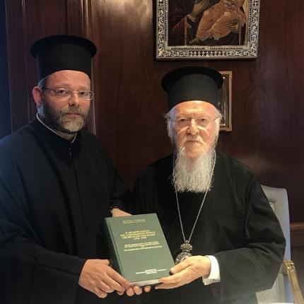 Στη συνάντηση παρέστησαν ο Σεβ. Μητροπολίτης Γέρων Χαλκηδόνος κ. Εμμανουήλ, και ο Πανοσιολ. Μ. Εκκλησιάρχης κ. Αέτιος, Διευθυντής του Ιδιαιτέρου Πατριαρχικού Γραφείου".