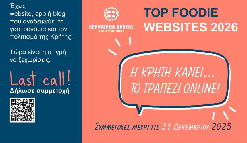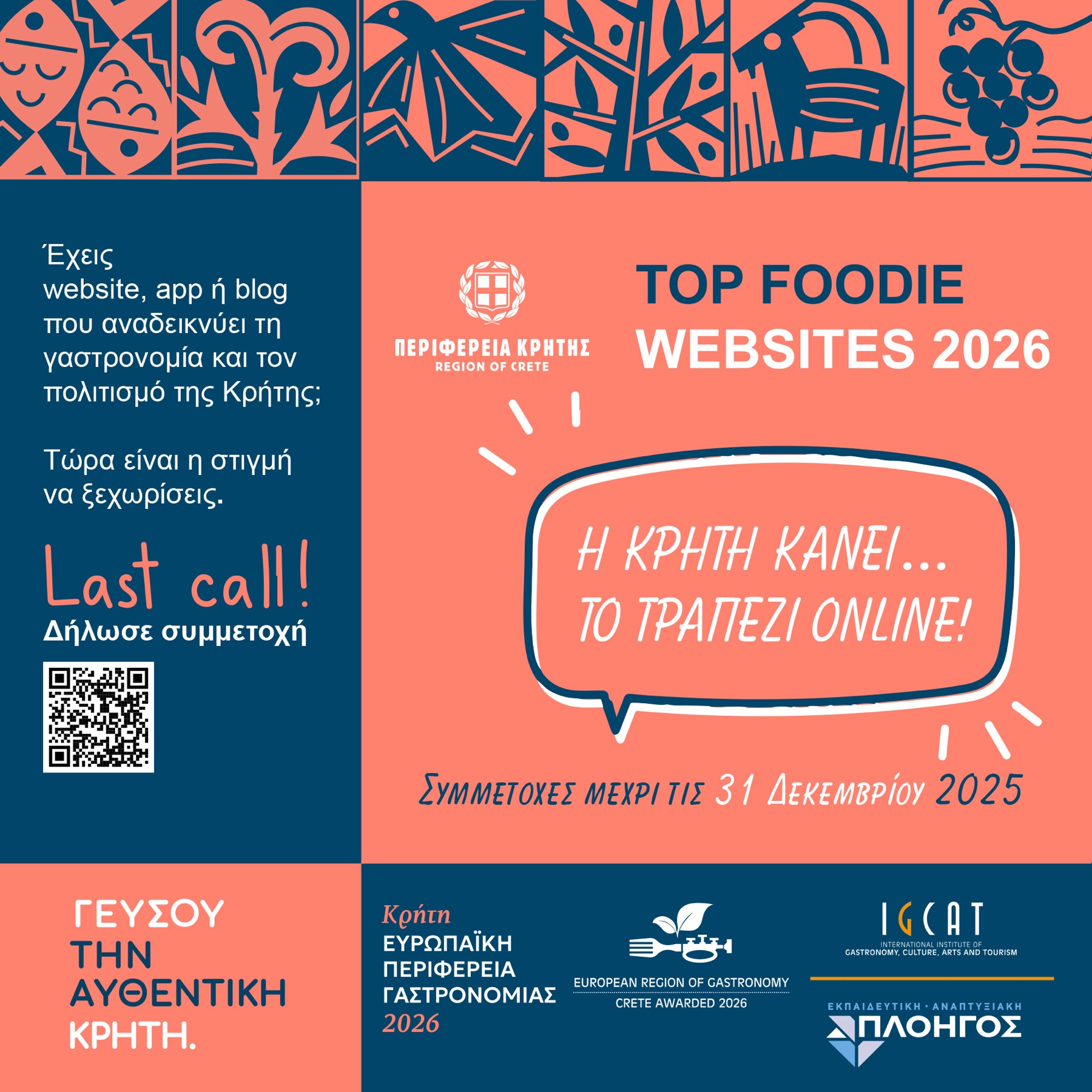Όλες οι πληροφορίες, οι όροι, οι οδηγίες συμμετοχής και η φόρμα υποβολής είναι διαθέσιμες στον σύνδεσμο https://ibo.crete.gov.gr/call-for-top-foodie-websites-2026/