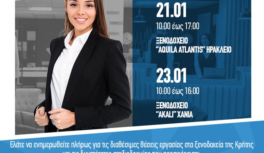 Ο Παγκρήτιος Σύλλογος Διευθυντών Ξενοδοχείων και η Περιφέρεια Κρήτης, αναγνωρίζοντας τη σημασία που έχει ο Τουρισμός στην Κρήτη, αλλά και τις μεγάλες δυνατότητες που προσφέρει ο ξενοδοχειακός κλάδος του νησιού στον τομέα της εργασίας, συνδιοργανώνουν την «5η Παγκρήτια ημέρα καριέρας στις Ξενοδοχειακές μονάδες της Κρήτης».
