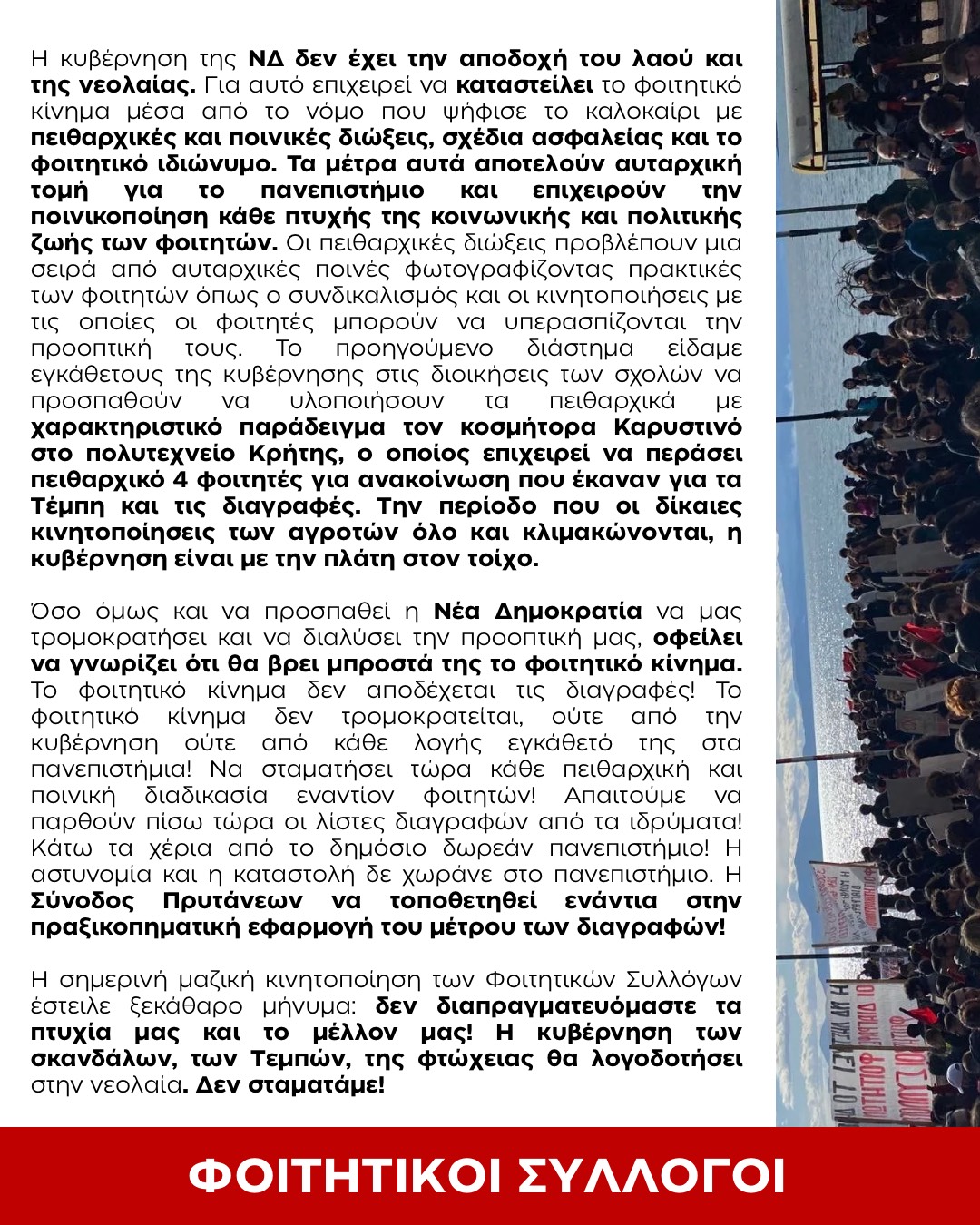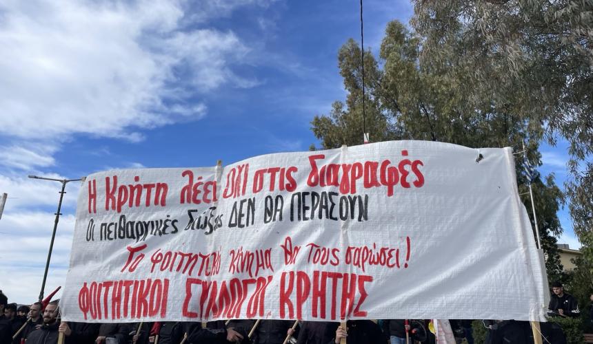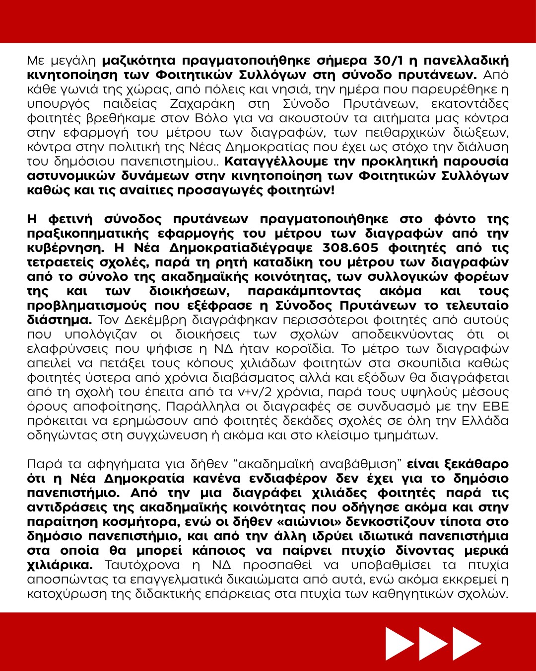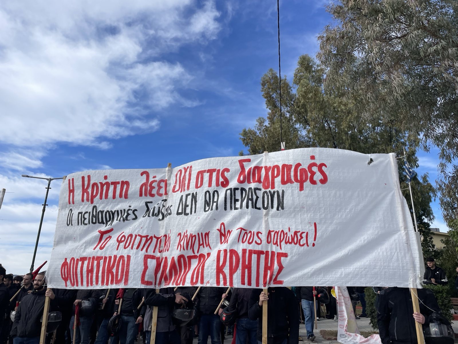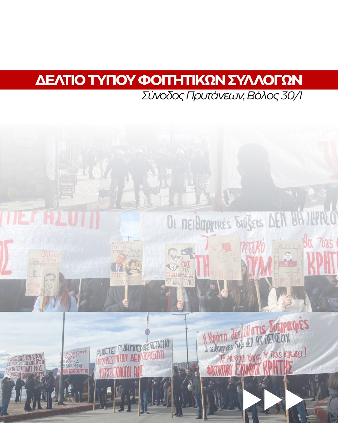 Χθες Παρασκευή 30/1 Φοιτητικοί Σύλλογοι από όλη την Ελλάδα πραγματοποιήσαμε πολύ μαζική κινητοποίηση στη Σύνοδο Πρυτάνεων στην Αγριά Βόλου. Και οι Φοιτητικοί Σύλλογοι από την Κρήτη, από το Ηράκλειο, το Ρέθυμνο και τα Χανιά βρεθήκαμε εκεί μαζικά, εν μέσω εξεταστικών, καθώς η φετινή σύνοδος πραγματοποιήθηκε στο φόντο της πραξικοπηματικής εφαρμογής του μέτρου των διαγραφών από την κυβέρνηση με χαρακτηριστική τη διαγραφή 308.000 φοιτητών από τα ελληνικά ΑΕΙ. Η χθεσινή κινητοποίηση έστειλε ξεκάθαρο μήνυμα ότι δεν διαπραγματευόμαστε τα πτυχία και το μέλλον μας και δεν πρόκειται να σταματήσουμε να παλεύουμε γι' αυτά!