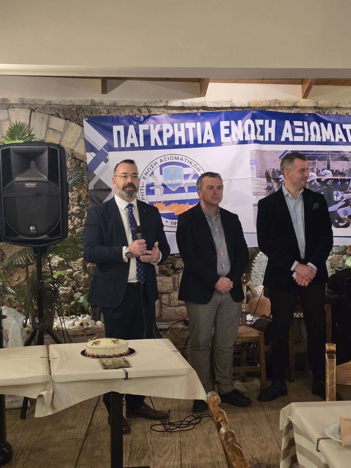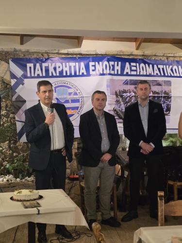 Κατά τον χαιρετισμό του ο Πρόεδρος της Ένωσης Αξιωματικών ΕΛ.ΑΣ. Περιφέρειας Κρήτης Καρακούδης Στυλιανός, αναφέρθηκε στις επιτυχίες της Πανελλήνιας Ομοσπονδίας Αξιωματικών Αστυνομίας (Π.Ο.ΑΞΙ.Α.) σε κοινή συνεργασία με την ΠΟΑΣΥ και τις άλλες ομοσπονδίες των σωμάτων ασφαλείας το τελευταίο χρονικό διάστημα, και ειδικότερα :