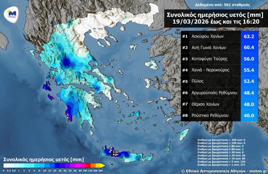 Σύμφωνα με τα στοιχεία του Εθνικό Αστεροσκοπείο Αθηνών και της υπηρεσίας meteo.gr έως τις 16:20 της Πέμπτης 19 Μαρτίου, οι περιοχές της Κρήτης κυριαρχούν στις υψηλότερες καταγραφές ημερήσιου υετού.