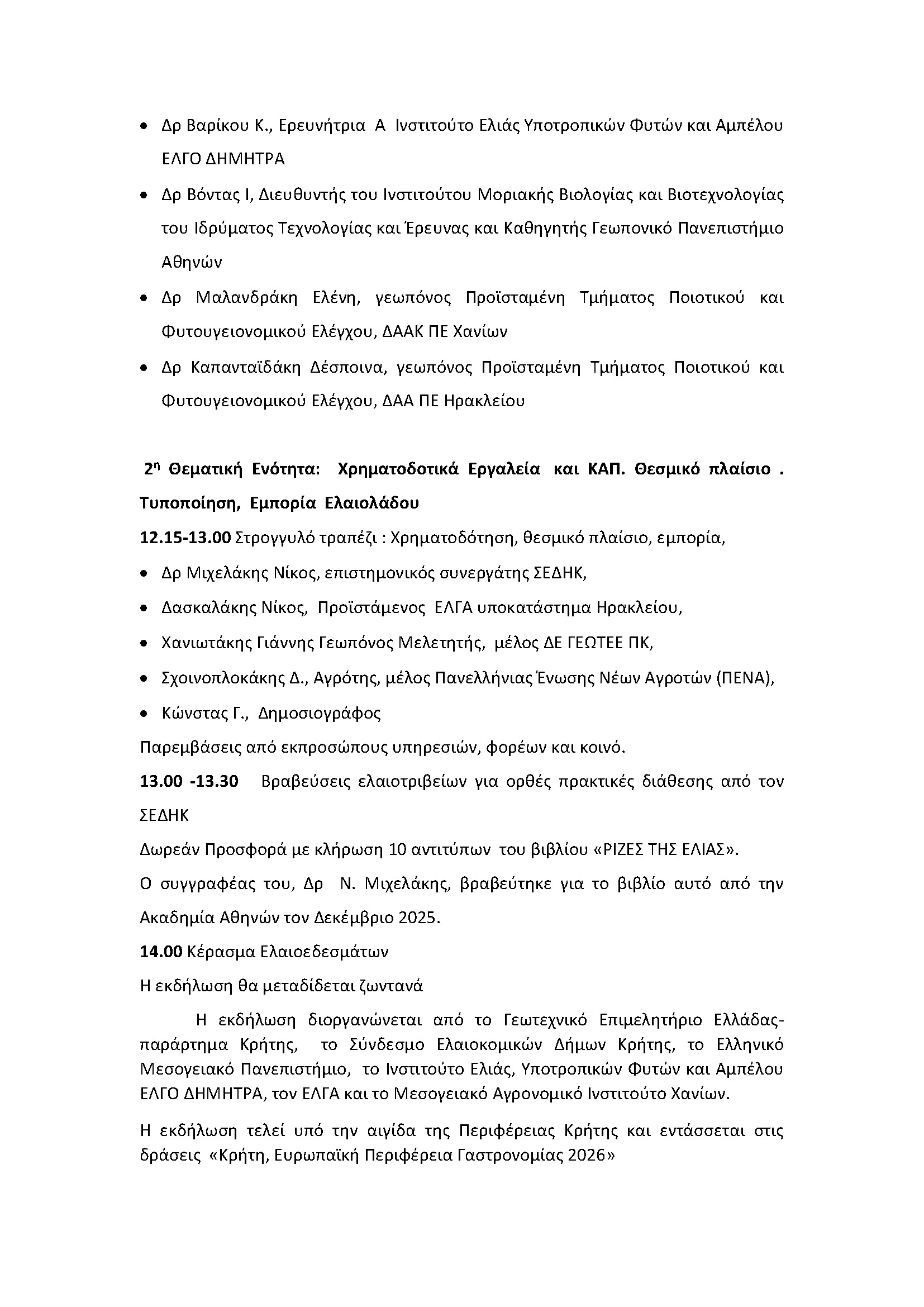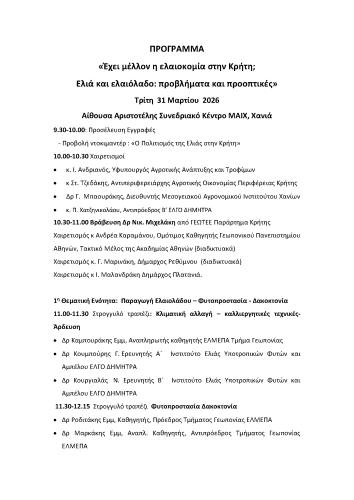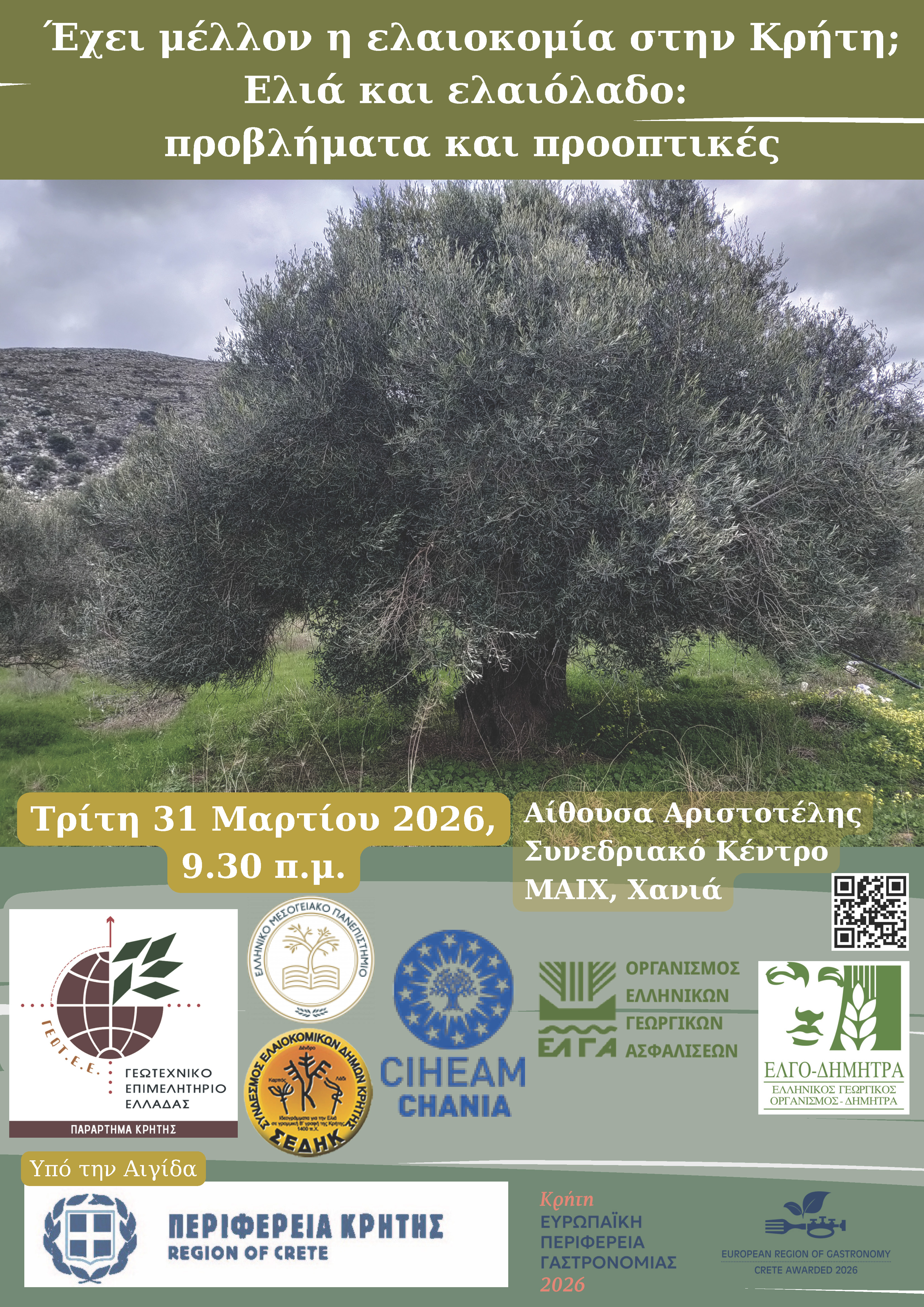 Το ΓΕΩΤΕΕ Παράρτημα Κρήτης σε συνεργασία με τον Σύνδεσμο Ελαιοκομικών Δήμων Κρήτης (ΣΕΔΗΚ), το Ελληνικό Μεσογειακό Πανεπιστήμιο, το Ινστιτούτο Ελιάς, Υποτροπικών Φυτών και Αμπέλου ΕΛΓΟ ΔΗΜΗΤΡΑ, τον ΕΛΓΑ και το ΜΑΙΧ διοργανώνουν εκδήλωση με θέμα:
