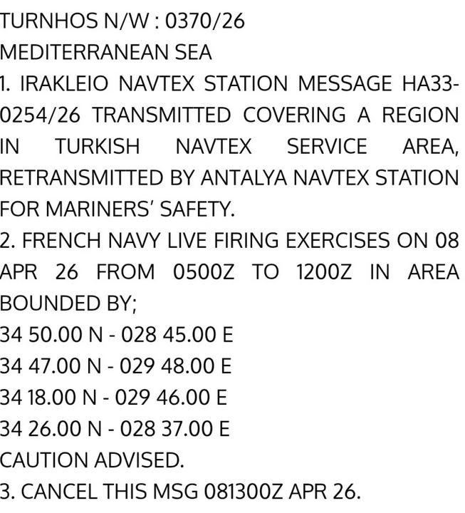 Ο Σταθμός Ηρακλείου εξέδωσε NAVTEX (254/26) για τη διεξαγωγή μεγάλης άσκησης του Γαλλικού Ναυτικού, στις 5-8 Απριλίου, σε δύο θαλάσσιες περιοχές: δυτικά και ανατολικά της Κρήτης. Η περιοχή ανατολικά της Κρήτης βρίσκεται εντός του FIR Αθηνών και της ελληνικής περιοχής ευθύνης για έκδοση NAVTEX, την οποία αμφισβητεί η Τουρκία.