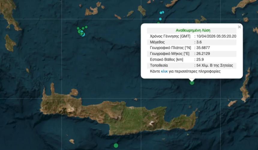 ΚΡΗΤΗ 10.04.2026 09:22Σεισμός το πρωί της Μεγάλης Παρασκευής βόρεια της Κρήτης Ρέθεμνος Newsroom Facebook Twitter Copy link 0 Σεισμός μεγέθους 3,6 Ρίχτερ σημειώθηκε το πρωί της Μεγάλης Παρασκευής, λίγο μετά τις 08:30. Σύμφωνα με το Γεωδυναμικό Ινστιτούτο, το επίκεντρο βρισκόταν 54χλμ βόρεια της Σητείας, ενώ το εστιακό βάθος στα 25,9 χλμ. 0 Facebook Twitter Copy link ΣΧΕΤΙΚΑ ΑΡΘΡΑ Κρήτη 11.04.2026 22:38Σταύρος Αρναουτάκης: «Το Άγιο Φως μεταφέρει το μήνυμα της ελπίδας και της Ανάστασης σε ολόκληρη την Κρήτη» Κρήτη 11.04.2026 18:46 Κρήτη: Αναβαθμίζεται και αδειοδοτείται το δημοτικό ελικοδρόμιο της Γαύδου Κρήτη 11.04.2026 08:51Απαγορεύτηκε η πρόσβαση στα Σεϊτάν Λιμάνια λόγω κατολίσθησης Κρήτη 11.04.2026 08:49Κρήτη: «Αναιμικό» το Πάσχα για τον τουρισμό – Χειρότερες οι επιδόσεις ακόμα και από τα Χριστούγεννα
