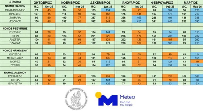 Η αριστερή στήλη (ΜΟ) σε κάθε μήνα δίνει τον μέσο όρο μηνιαίου ύψους βροχής (για την περίοδο λειτουργίας κάθε σταθμού), ενώ η δεξιά στήλη το αθροιστικό ύψος βροχής των μηνών Οκτωβρίου 2025 – Μαρτίου 2026. Με πορτοκαλί χρώμα σημειώνονται οι σταθμοί με βροχή χαμηλότερη του μέσου όρου, ενώ με γαλάζιο οι σταθμοί με βροχή υψηλότερη του μέσου όρου.