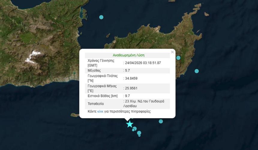 Σύμφωνα με το Γεωδυναμικό Ινστιτούτο του Εθνικού Αστεροσκοπείου Αθηνών, το επίκεντρο της δόνησης εντοπίζεται στον θαλάσσιο χώρο 18 χλμ. νότια του Γούδουρα Λασιθίου.