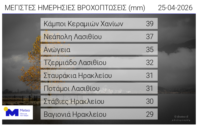 Σύμφωνα με στοιχεία από τις μετρήσεις του meteo / Εθνικού Αστεροσκοπείου Αθηνών, στους Κάμπους Κεραμιών Χανίων, καταγράφηκαν τα μεγαλύτερα ύψη βροχής στη χώρα με 39 χιλιοστά, ενώ ακολουθούν Νεάπολη Λασιθίου, Ανώγεια, Τζερμιάδο Λασιθίου, Σταυράκια Ηρακλείου κ.α.