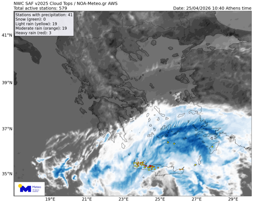 Όπως αναφέρει άρθρο του meteo.gr, συνεχίστηκαν οι βροχοπτώσεις στην Κρήτη αλλά κατά τόπους και στις Νότιες Κυκλάδες και στα Δωδεκάνησα, το πρωί του Σαββάτου 25/04.