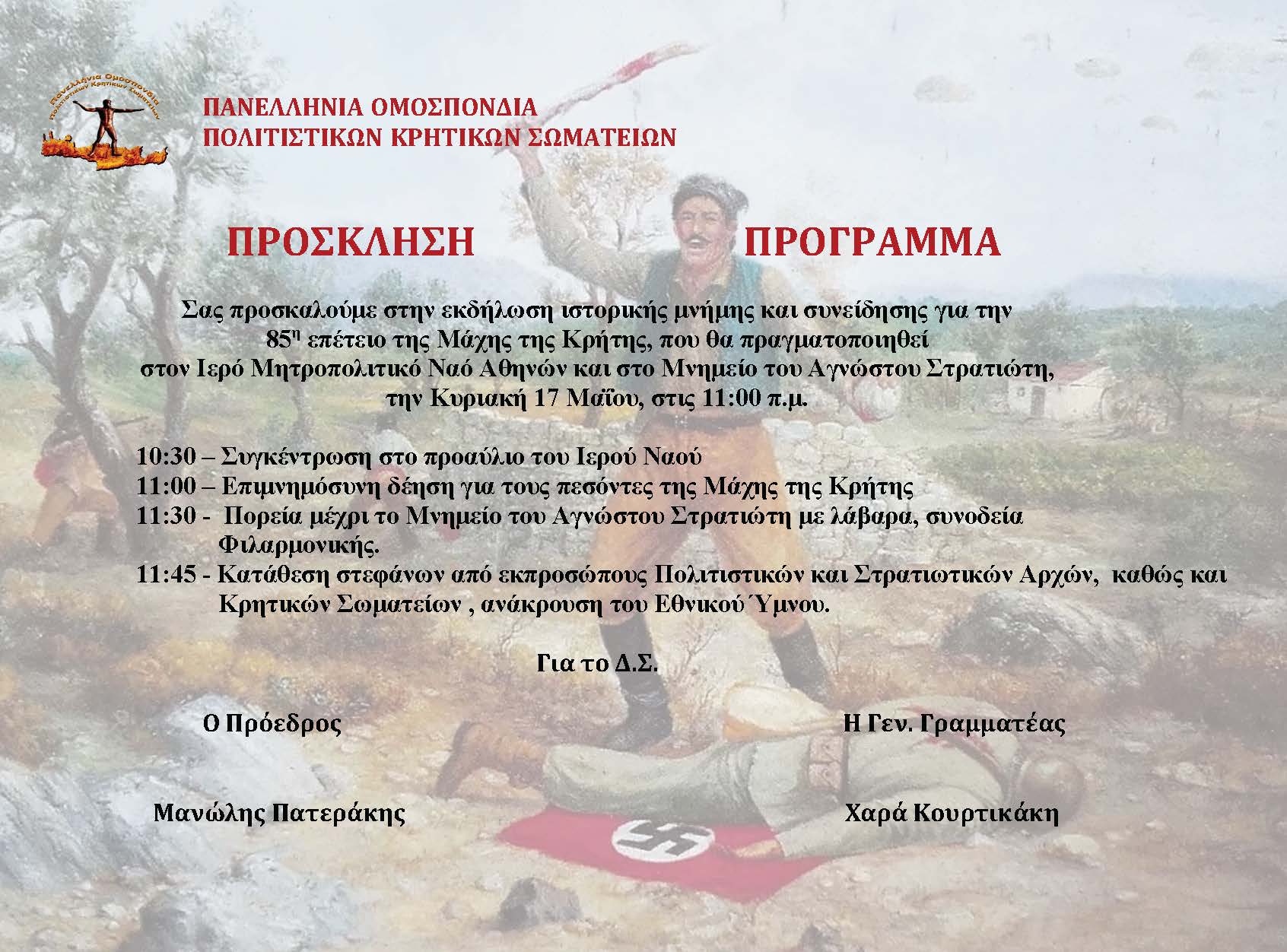 Με μια εκδήλωση υψηλού συμβολισμού και ιστορικής σημασίας, η Πανελλήνια Ομοσπονδία Πολιτιστικών Κρητικών Σωματείων διοργανώνει στην Αθήνα τις επετειακές εκδηλώσεις μνήμης για την 85η επέτειο της Μάχης της Κρήτης, την Κυριακή 17 Μαΐου.