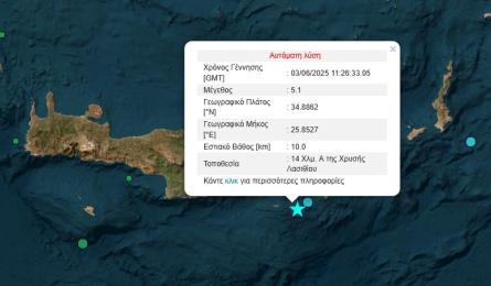 Σεισμός αισθητός στην Κρήτη Ισχυρή σεισμική δόνηση έγινε αισθητή λίγα λεπτά πριν από τις 2 και 30 στην Κρήτη. Σύμφωνα με την αυτόματη λύση του Γεωδυναμικού Ινστιτούτου ήταν... 03.06.2025 14:31