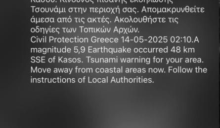 Έκτακτο: Μήνυμα από το 112 για πιθανή εκδήλωση τσουνάμι μετά τον σεισμό των 6,1 ρίχτερ Προειδοποιητικό μήνυμα από το 112 για πιθανή εκδήλωση τσουνάμι μετά τον σεισμό των 6,1 ανατολικά της Κρήτης έχουν λάβει αρκετοί κάτοικοι του νησιού... 14.05.2025 02:20
