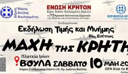 Εκδήλωση τιμής και μνήμης για την 84η Επέτειο της Μάχης της Κρήτης Η Ένωση Κρητών Βάρης, Βούλας, Βουλιαγμένης, Βάρκιζας, σε συνεργασία με 13 ακόμα Κρητικά Πολιτιστικά Σωματεία της Βόρειας και Ανατολικής Αττικής... 01.05.2025 01:06