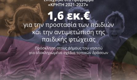 Περιφέρεια Κρήτης: 1,6 εκ. ευρώ για την προστασία των παιδιών και την αντιμετώπιση της παιδικής φτώχειας Πρόσκληση στους Δήμους του νησιού για ολοκληρωμένα σχέδια τοπικών δράσεων Την πρόσκληση για την υποβολή προτάσεων στη δράση «Ολοκληρωμένα Σχέδια... 24.11.2025 17:21