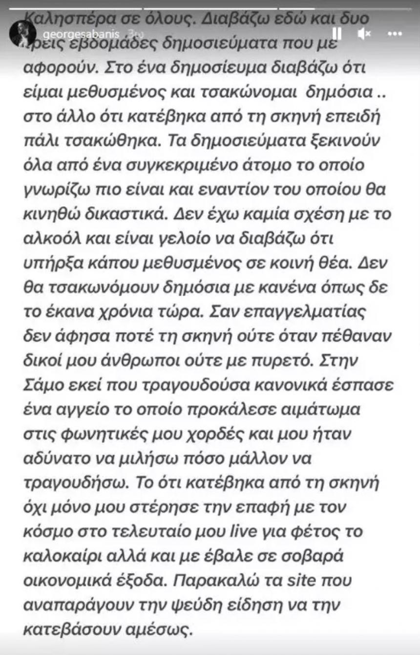«Το ότι κατέβηκα από τη σκηνή όχι μόνο μου στέρησε την επαφή με τον κόσμο στο τελευταίο μου live για φέτος το καλοκαίρι αλλά και με έβαλε σε σοβαρά οικονομικά έξοδα. Παρακαλώ τα site που αναπαράγουν την ψεύδη είδηση να την κατεβάσουν αμέσως».