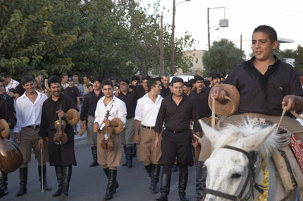 Τα όργανα μπροστά με τραγούδια, πίσω ο γαμπρός με γονέους και αδέρφια και ξοπίσω όλοι οι καλεσμένοι τους.