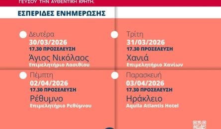 Η Κρήτη σχεδιάζει το μέλλον της ελαιοκομίας: Μεγάλη επιτυχία και μαζική συμμετοχή στην εκδήλωση για το Μέλλον της Ελαιοκομίας στην Κρήτη Με ιδιαίτερο ενδιαφέρον πραγματοποιήθηκε την Τρίτη 31 Μαρτίου εκδήλωση με θέμα: «Έχει μέλλον η ελαιοκομία στην Κρήτη; Ελιά και... 02.04.2026 13:31