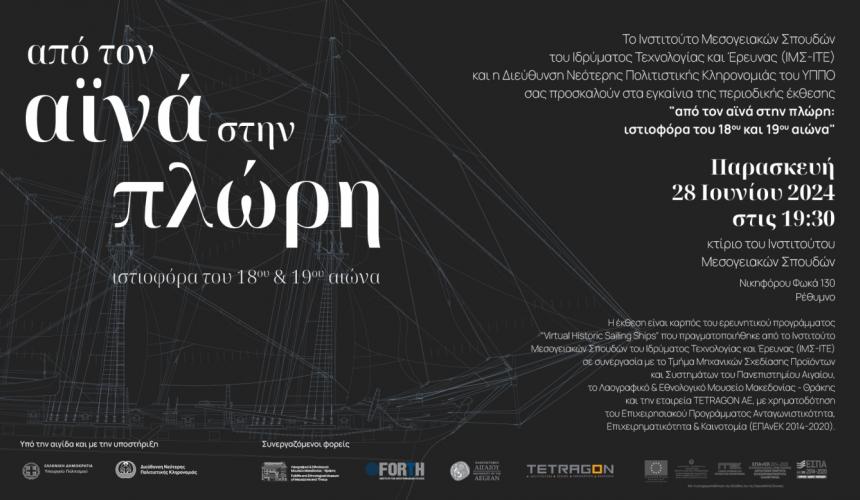 Το Ινστιτούτο Μεσογειακών Σπουδών του Ιδρύματος Τεχνολογίας και Έρευνας (ΙΜΣ-ΙΤΕ) και η Διεύθυνση Νεότερης Πολιτιστικής Κληρονομιάς του ΥΠΠΟ σας προσκαλούν στα εγκαίνια της περιοδικής έκθεσης “Από τον Αϊνά στην Πλώρη: Ιστιοφόρα του 18ου και 19ου αιώνα” την Παρασκευή 28 Ιουνίου 2024, στις 19:30, στο κτίριο του Ινστιτούτου Μεσογειακών Σπουδών, Νικηφόρου Φωκά 130, στο Ρέθυμνο.