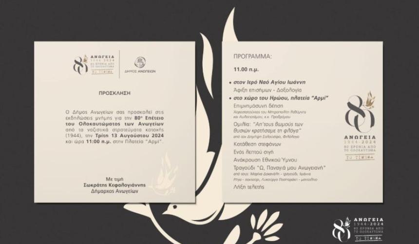 Ο Δήμος Ανωγείων διοργανώνει εκδηλώσεις μνήμης για την 80η επέτειο του Ολοκαυτώματος των Ανωγείων από τα ναζιστικά στρατεύματα κατοχής (1944) την Τρίτη 13 Αυγούστου και ώρα 11 π.μ. στην πλατεία Αρμί.