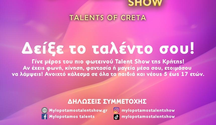 Το Mylopotamos Talents 2025 (Talents of Creta) ανοίγει τις πύλες του και καλεί παιδιά και εφήβους από 5 έως 17 ετων απο ολη την Κρητη να δηλώσουν συμμετοχή και να αναδείξουν το μοναδικό ταλέντο τους! Ο αγαπημένος θεσμός της Κρήτης, που πραγματοποιείται φέτος για 6η συνεχή χρονιά, συνεχίζει να προσφέρει βήμα στα νέα αστέρια του τόπου μας.